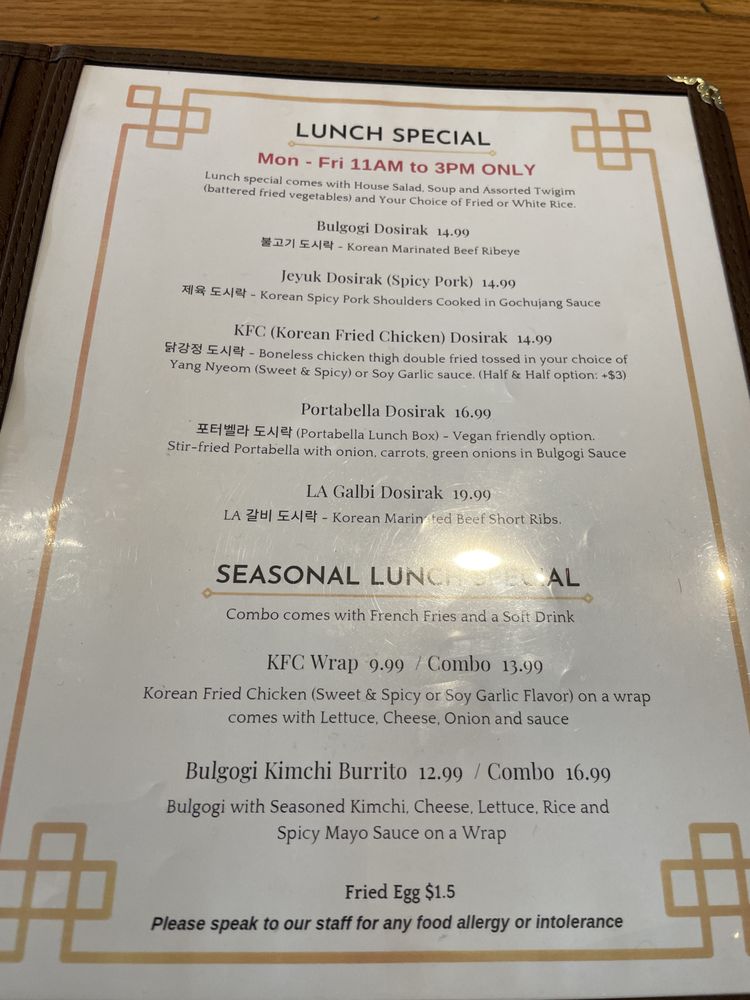 Perfect catering option, if you're looking to find an individual lunch box for your event!Our Dosirak comes with Main dish (Bulgogi, KFC, Spicy Pork, or Fried Portabella Mushrooms), white rice, Twigim (Fried onion, Mandu, Sweet Potato) and house salad.Minimum order for catering